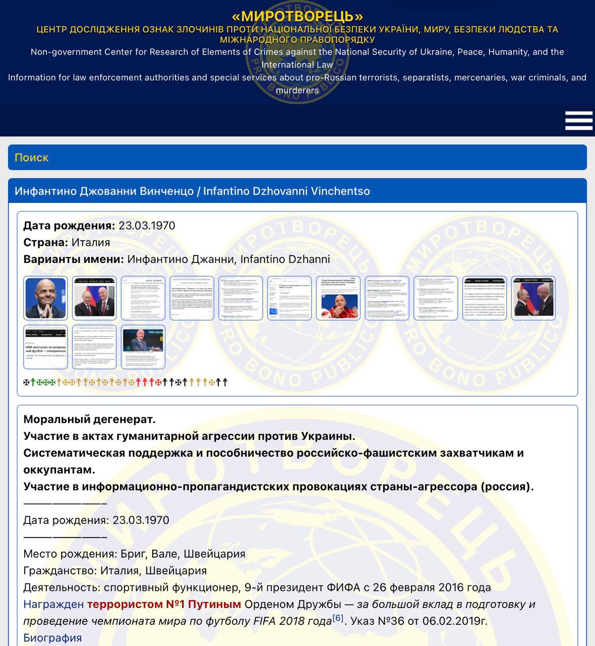 Сначала не поверила. Но все такПрезидента ФИФА Инфантино внесли в базу сайта «Миротворца» с пометкой «моральный дегенерат».Надеюсь, Италия и вся футбольная тусовка это оценят.