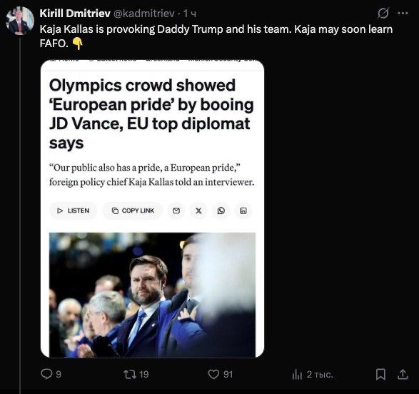 «Кая Каллас провоцирует папочку Трампа и его команду. Скоро Кая может узнать, что значит FAFO*», — так спецпредставитель президента Кирилл Дмитриев иронично прокомментировал заявление Каллас о том, что неодобрительный гул зрителей в адрес вице-президента США Вэнса на церемонии открытия Олимпийских игр — это проявление «европейского достоинства».