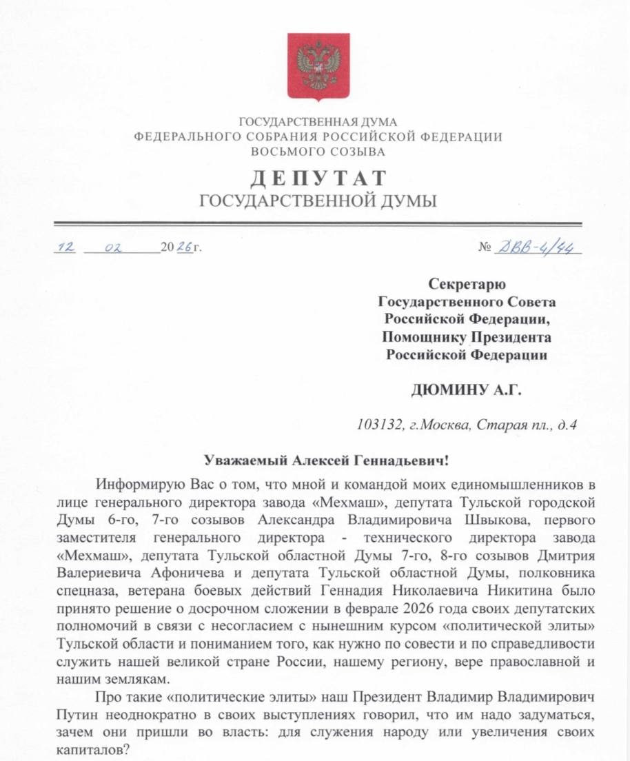 Депутат Госдумы от Тульской области Дзюба объяснил, почему сдает мандат: он выложил письмо, адресованное Дюмину