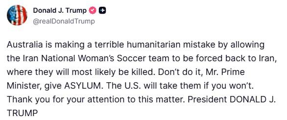 Австралия совершает ужасную гуманитарную ошибку, разрешая принудительное возвращение национальной женской сборной Ирана по футболу на родину, где их, скорее всего, убьют. Не делайте этого, господин премьер-министр — предоставьте им убежище. Если вы этого не сделаете, США примут их.