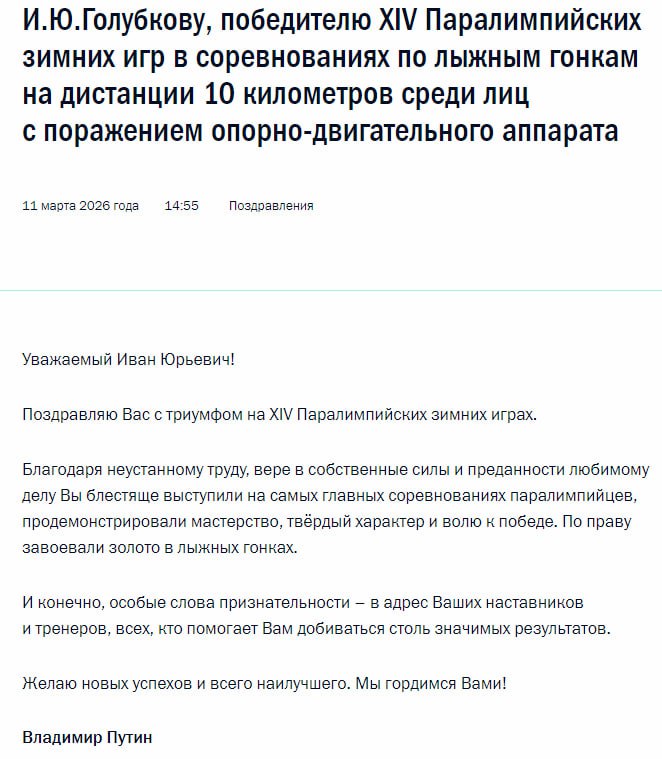Путин назвал блестящим выступление лыжника Голубкова на Паралимпиаде. Спортсмен продемонстрировал мастерство и твердый характер, подчеркнул президент в своем поздравлении.